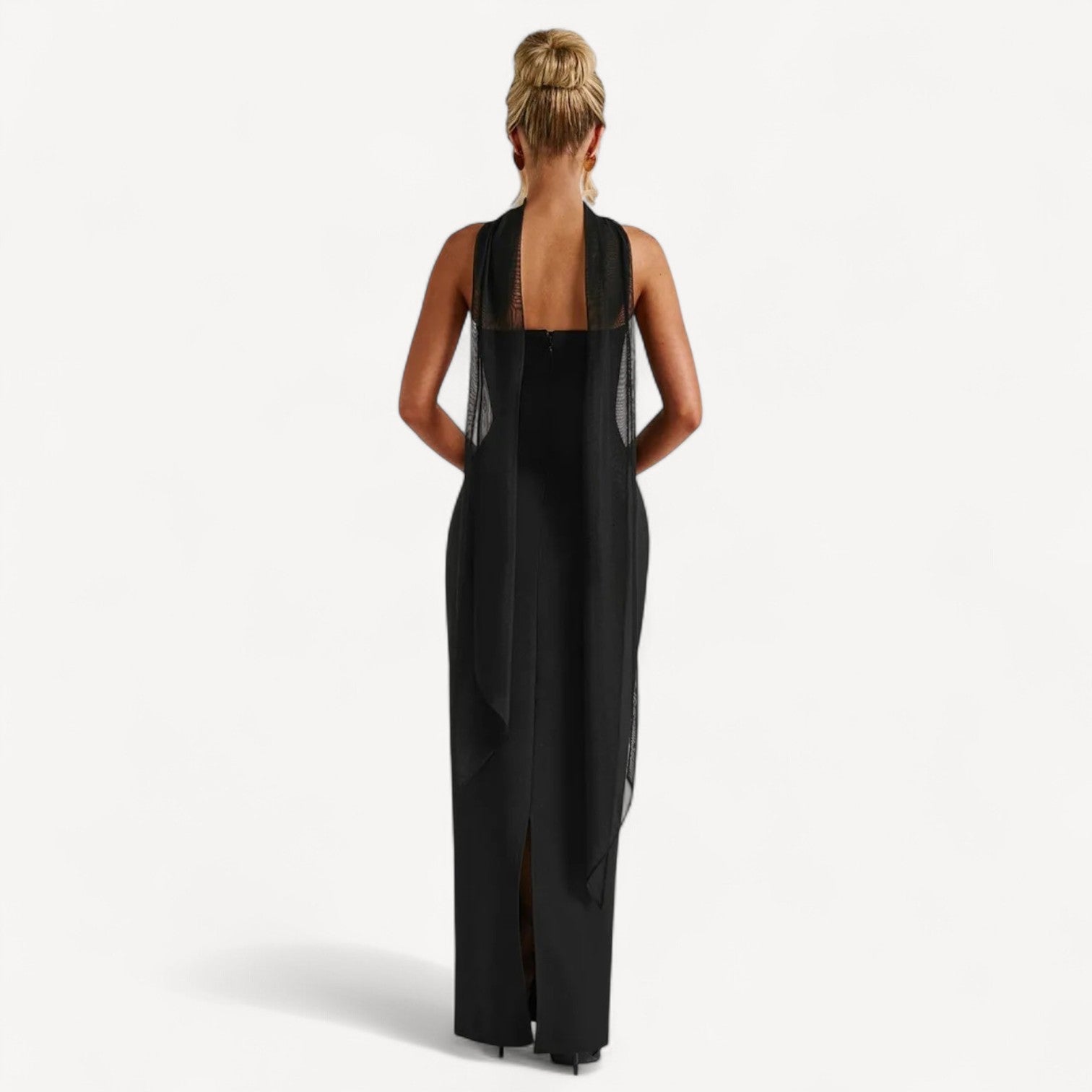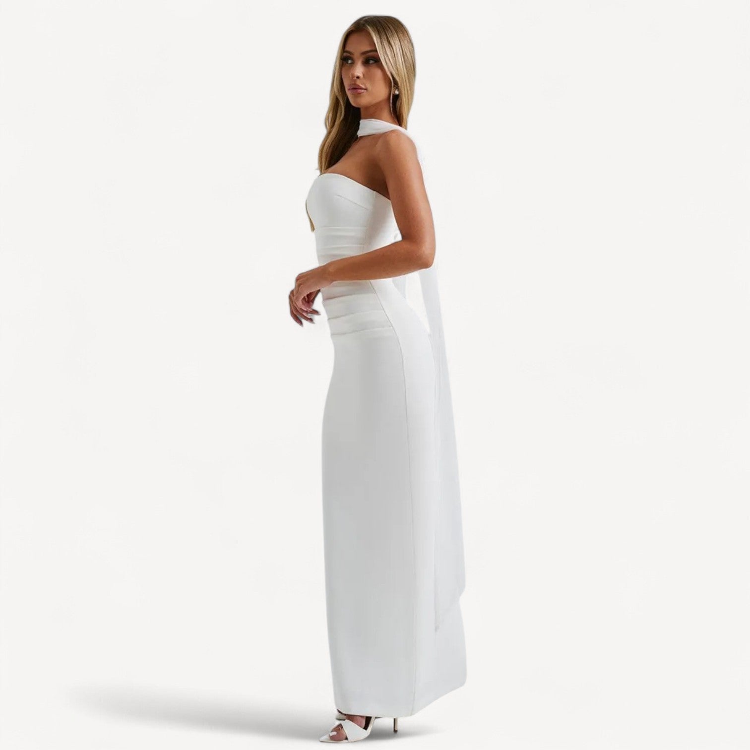 Turn heads with the Davies Elegant Strapless Evening Dress, crafted for moments that deserve to be unforgettable. This show-stopping piece features a sleek strapless neckline and a flowing scarf detail, combining modern glamour with timeless sophistication.