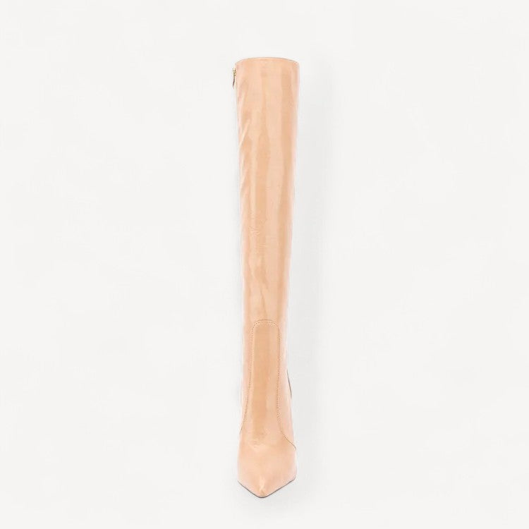 Turn every step into a statement with our high heel knee high boots for women. Designed with a sleek pointed toe, slim stiletto heel, and a smooth glossy finish, these boots exude modern elegance and confidence. The tall silhouette elongates your legs while the soft interior lining ensures comfort all day and night. Perfect for pairing with dresses, skirts, or skinny jeans — a must-have for sophisticated autumn and winter looks.
